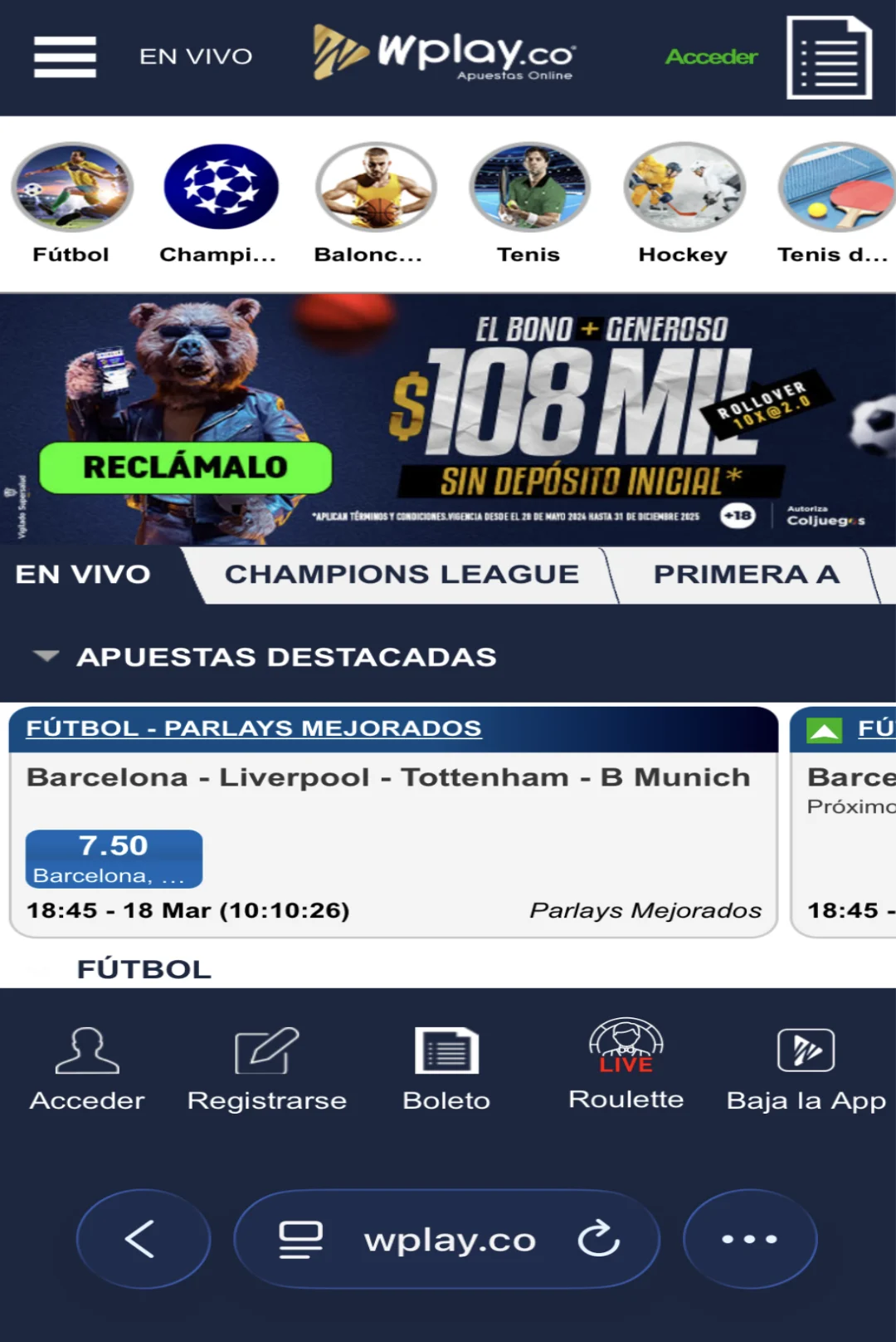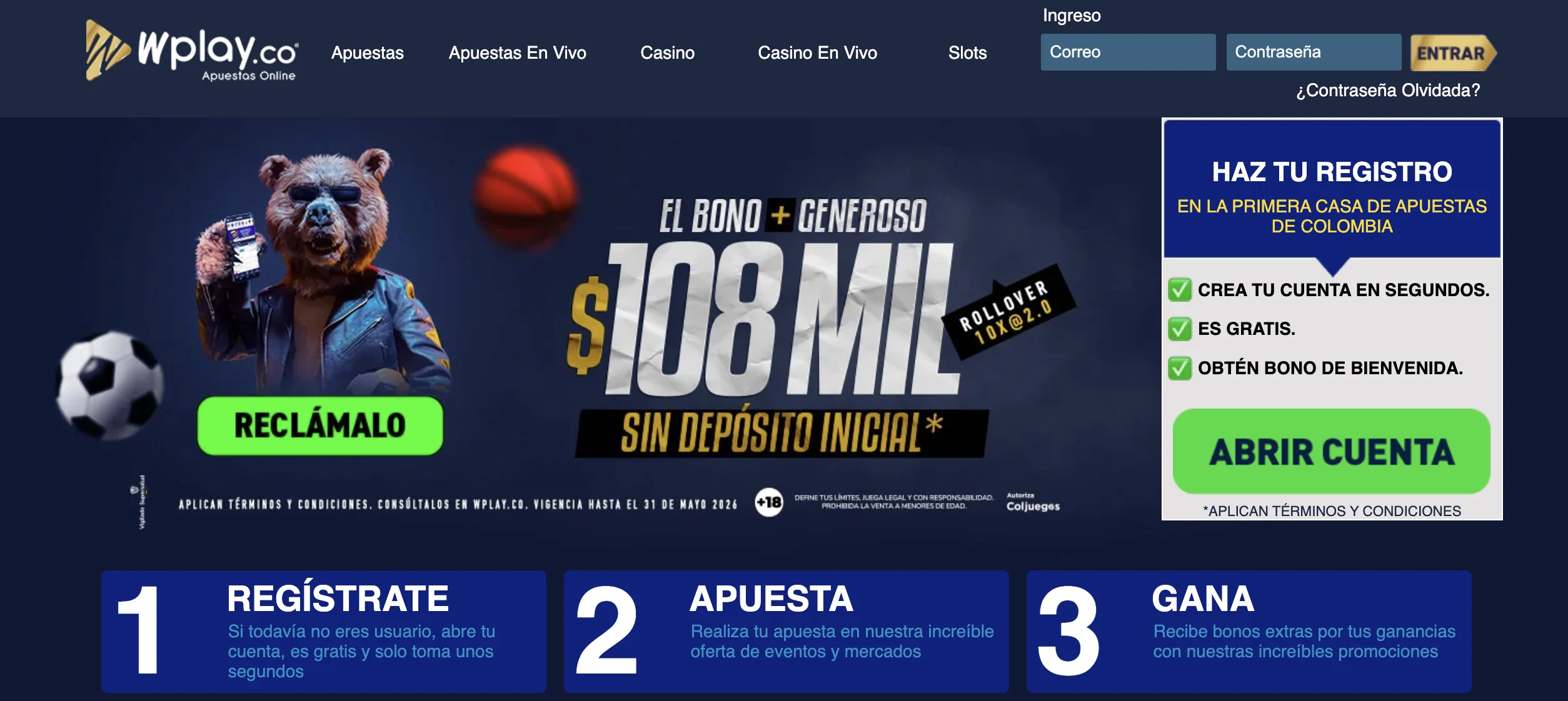- Bono de registro de 108.000 COP con rollover de 10x